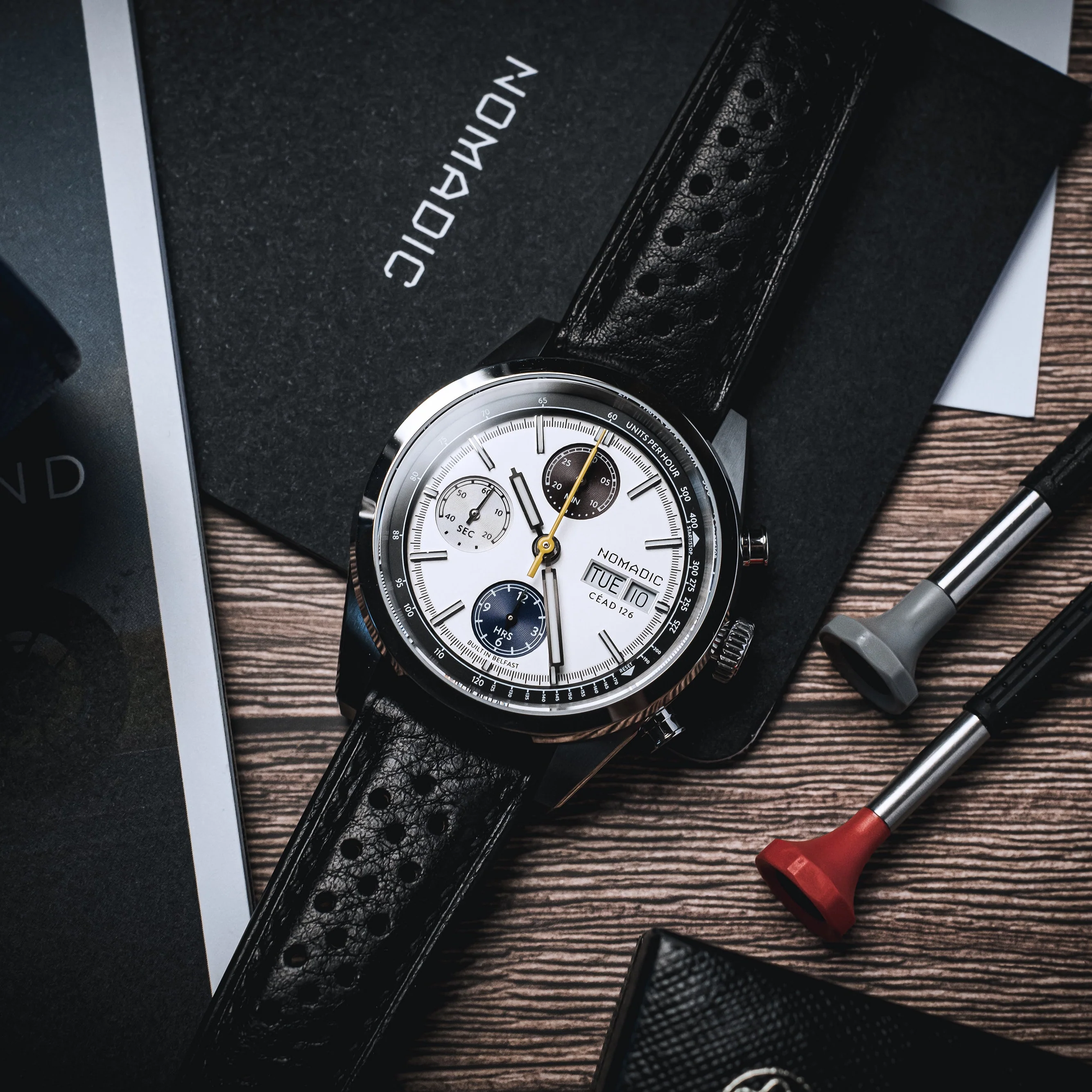 Based on our celebrated Cead 126 chronograph, this special edition features striking sub-dials in a selection of our signature colours; Ocean Blue, Navigator White, and Crimson Red, a refined nod to British identity, expressed through balanced colour and purposeful design.