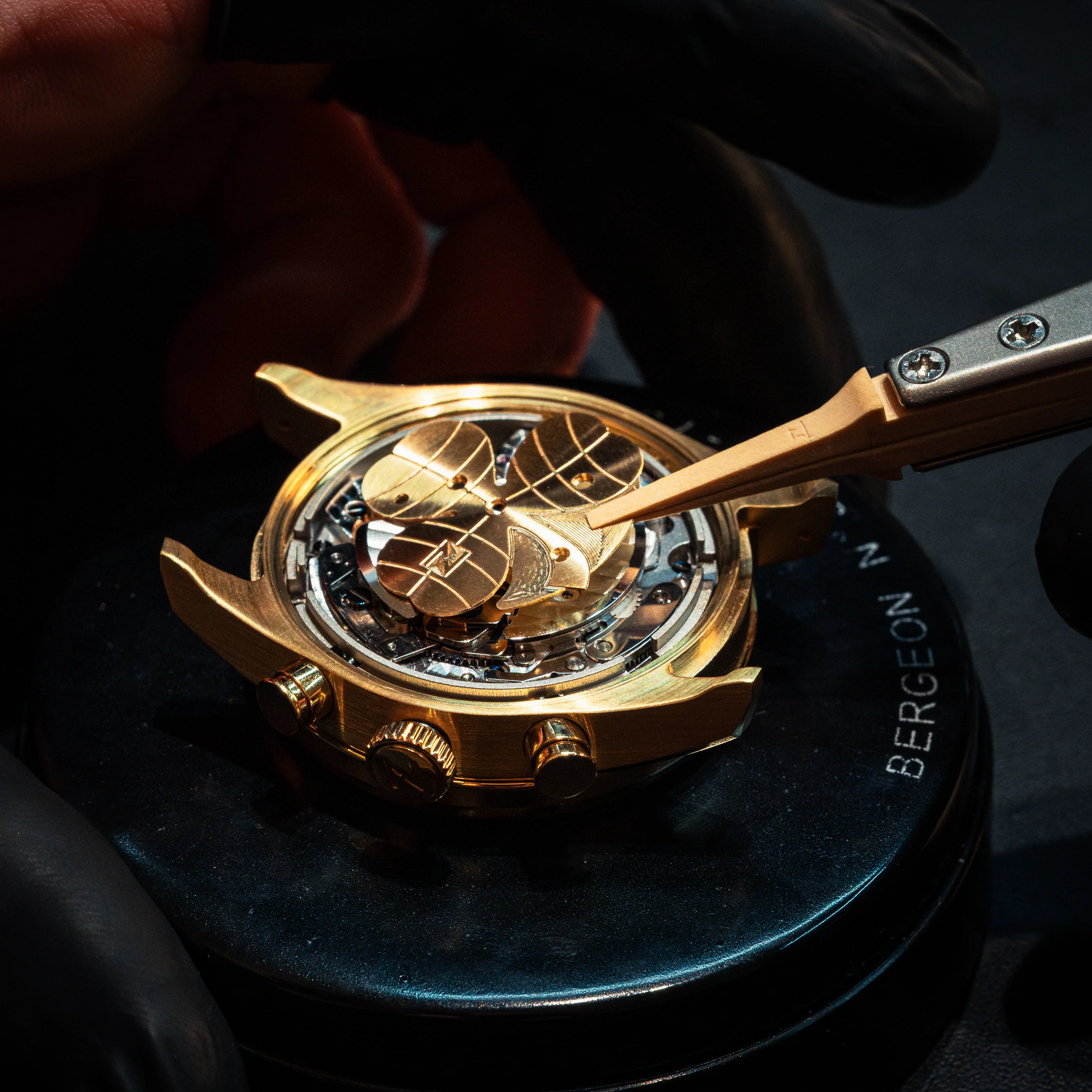 Crafted from 79.5 grams of solid 18k gold, spanning the case, decorative bridge, crown, chronograph pushers, and strap buckle. A rich green dial is paired with gold-plated indices and hands: for a refined balance of heritage and performance.